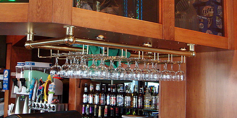 Stemware racks can be built with your choice of ¼” powder coated metal or brass rods, or 4” wide solid wood boards. Stemware racks can be attached with either metal or wood rails and are also available with 2” diameter tube frame that can be hung from the ceiling.