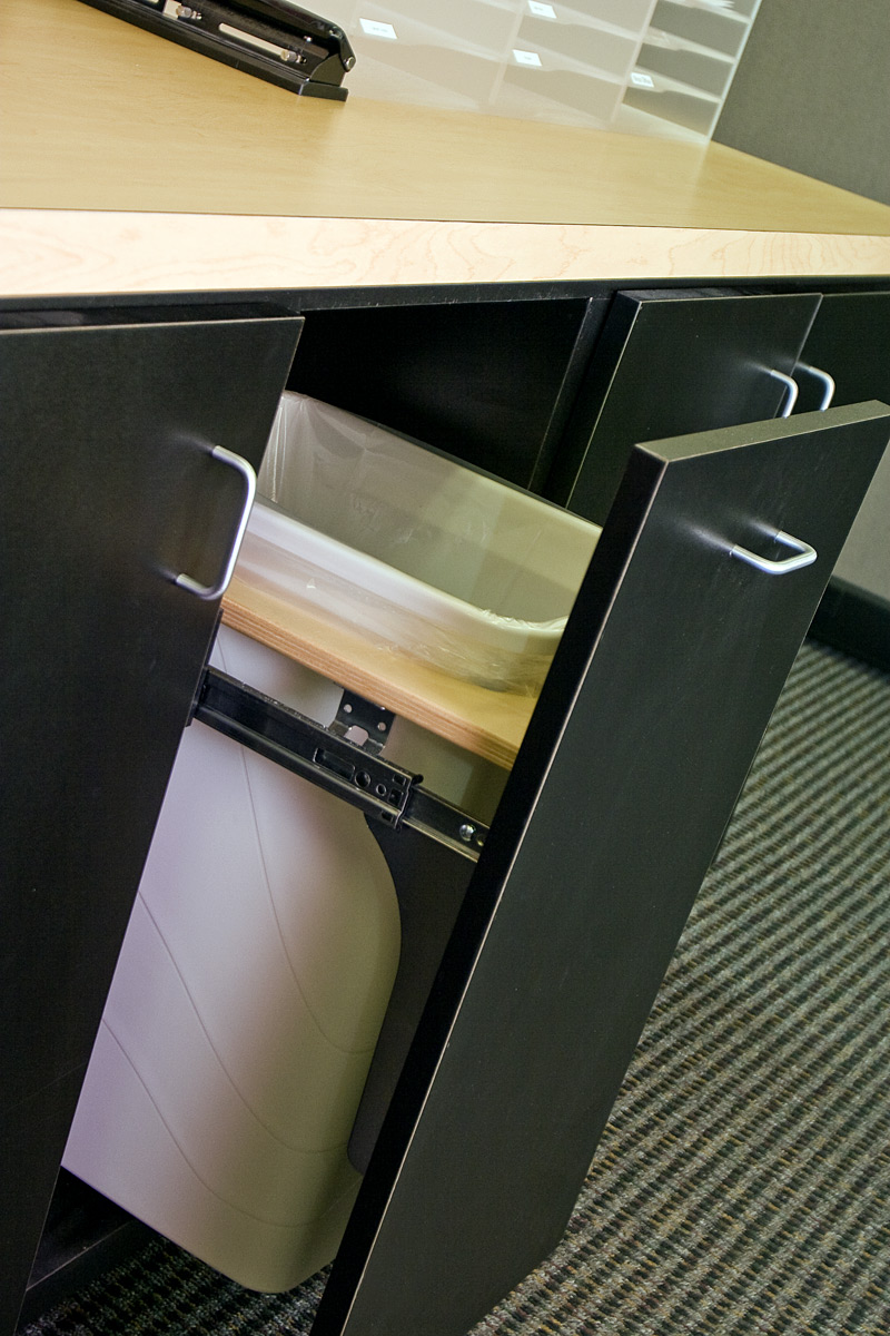 Felling Products can build a custom credenza to coordinate with your conference room furniture. Cabinets can be made to complement your board room with storage for A/V equipment, marketing materials, office storage or even a coffee counter. Credenza options include hinged doors, sliding doors or pocket doors, and adjustable or pull-out shelves and drawers. Cabinets can be covered with high pressured laminate plastic or wood veneer. Drawer and door can consist of a flat panel covered with plastic laminate or wood veneer, or a shaker style recessed wood panel or raised wood panel. Countertop material options include plastic laminate, wood veneer, solid surface or granite. A wide variety of edge styles are also available; self-edged, vinyl T edges, or PVC edges. Solid oak or solid maple wood is also an option and is available in a variety of sizes and profiles.