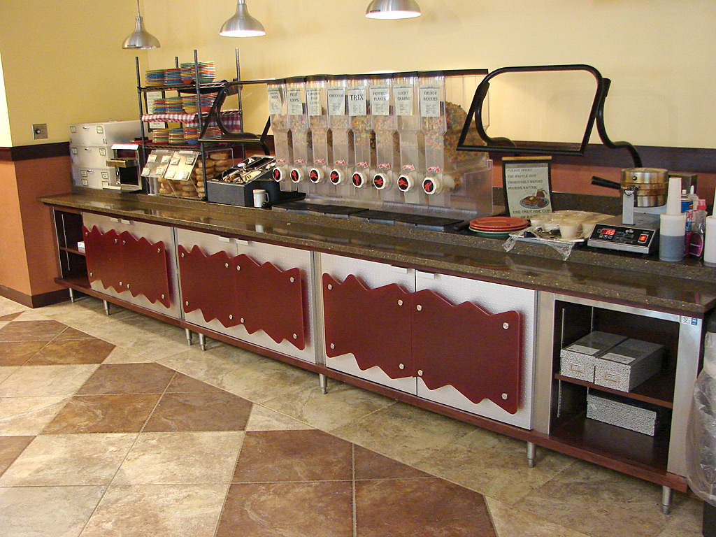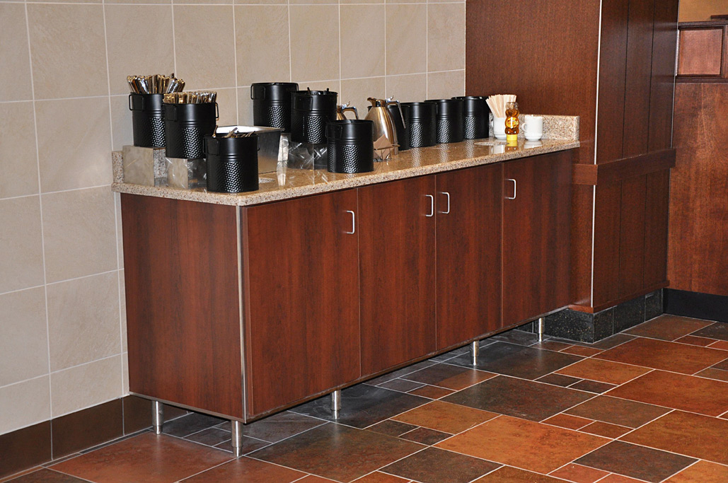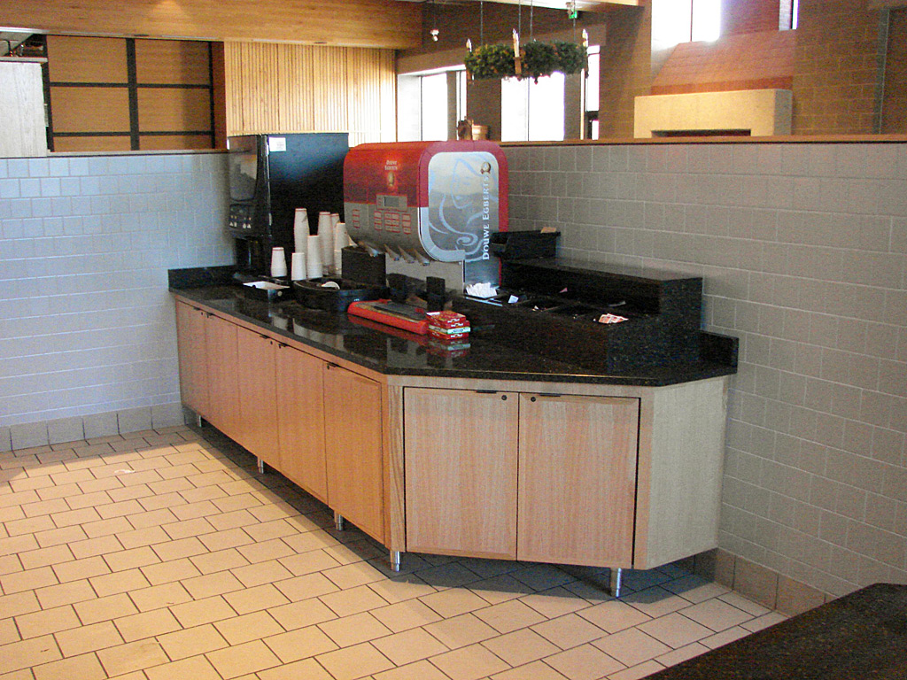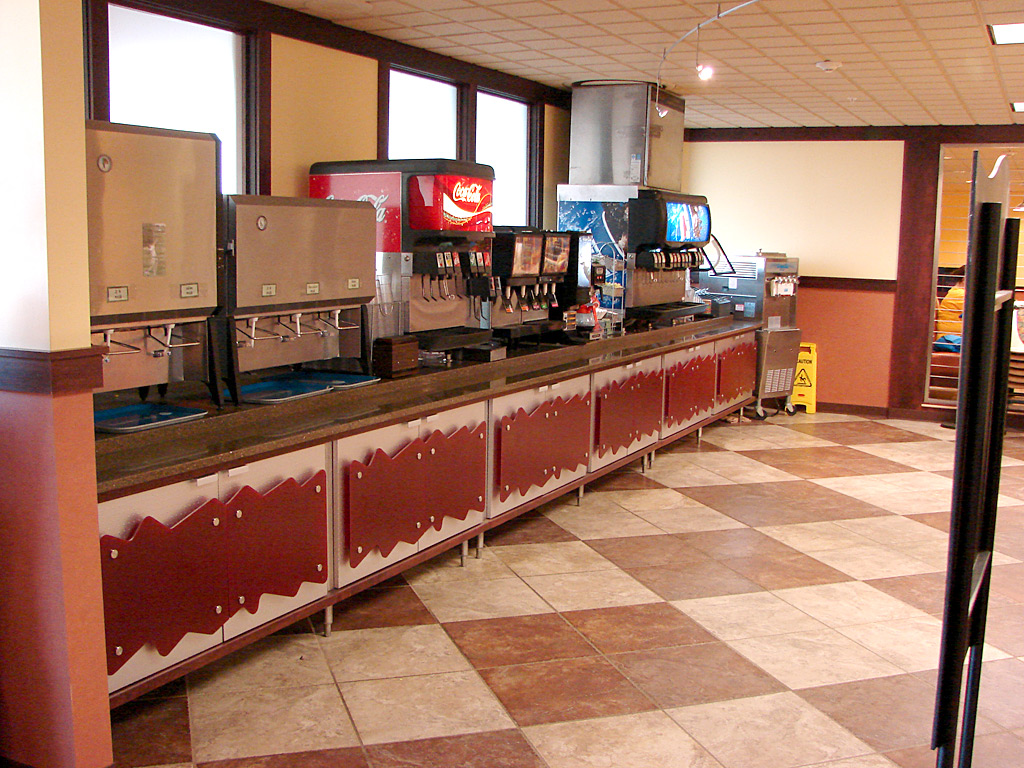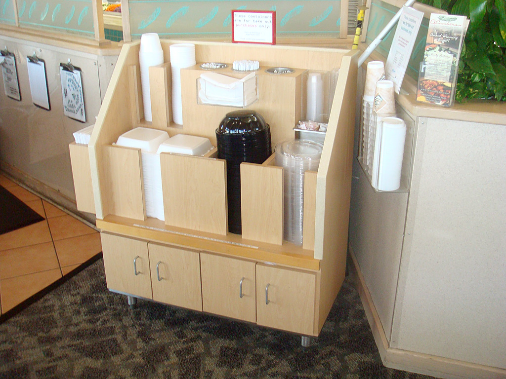 Beverage counters and condiment counters can be built to complement your serving counters. Cabinets are built of high quality materials to NSF standards and are made for strength and durability for commercial use. Beverage and condiment counters can include an extended countertop or a drop down tray slide. Beverage counters are built to accommodate your drop-in equipment and condiment counters can be built with casters for mobility.