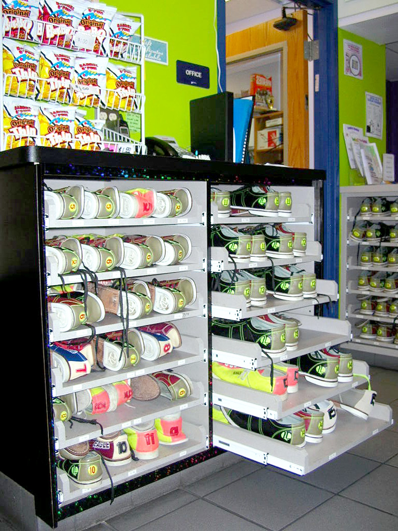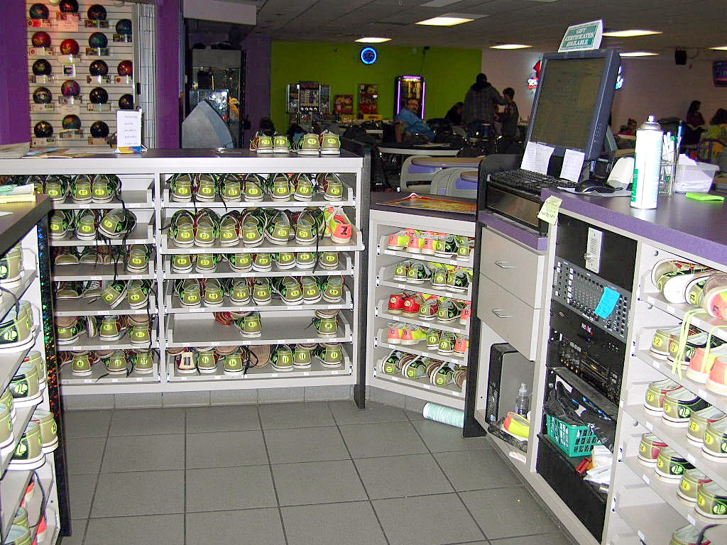 We helped design the control counter to incorporate shoe storage with pull-out shelves, recessed cashier area, opening for AV equipment, and ADA counter. The front counter also extends over to a bar area with beverage service and redemption area with lighted glass display for the game room. The face of the counters have a neon green accent and a holographic laminate.