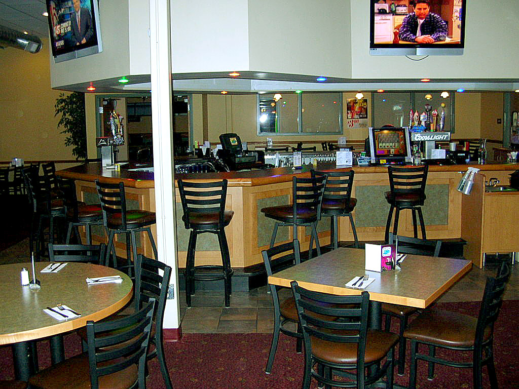 In the lounge area the bar fixture has front maple framed access panels for easy accessibility to electrical and plumbing. Bar top have a 3” bullnosed solid maple wood front edge and a 4” wide coved stainless steel glass rail. Bar has a semi-cantilevered foot rest and a waitress pick-up station with stainless steel dump sink and enclosed waste container.
