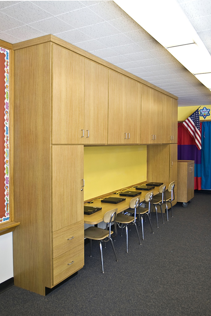 Felling Products worked with the elementary school to design a computer lab station for students in the classrooms. The computer lab station has a worktop area for computers with storage areas on both sides and above. We also designed some computer station tables for the library. Each table has six pull-out keyboards and a center wire chase.