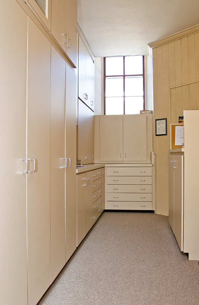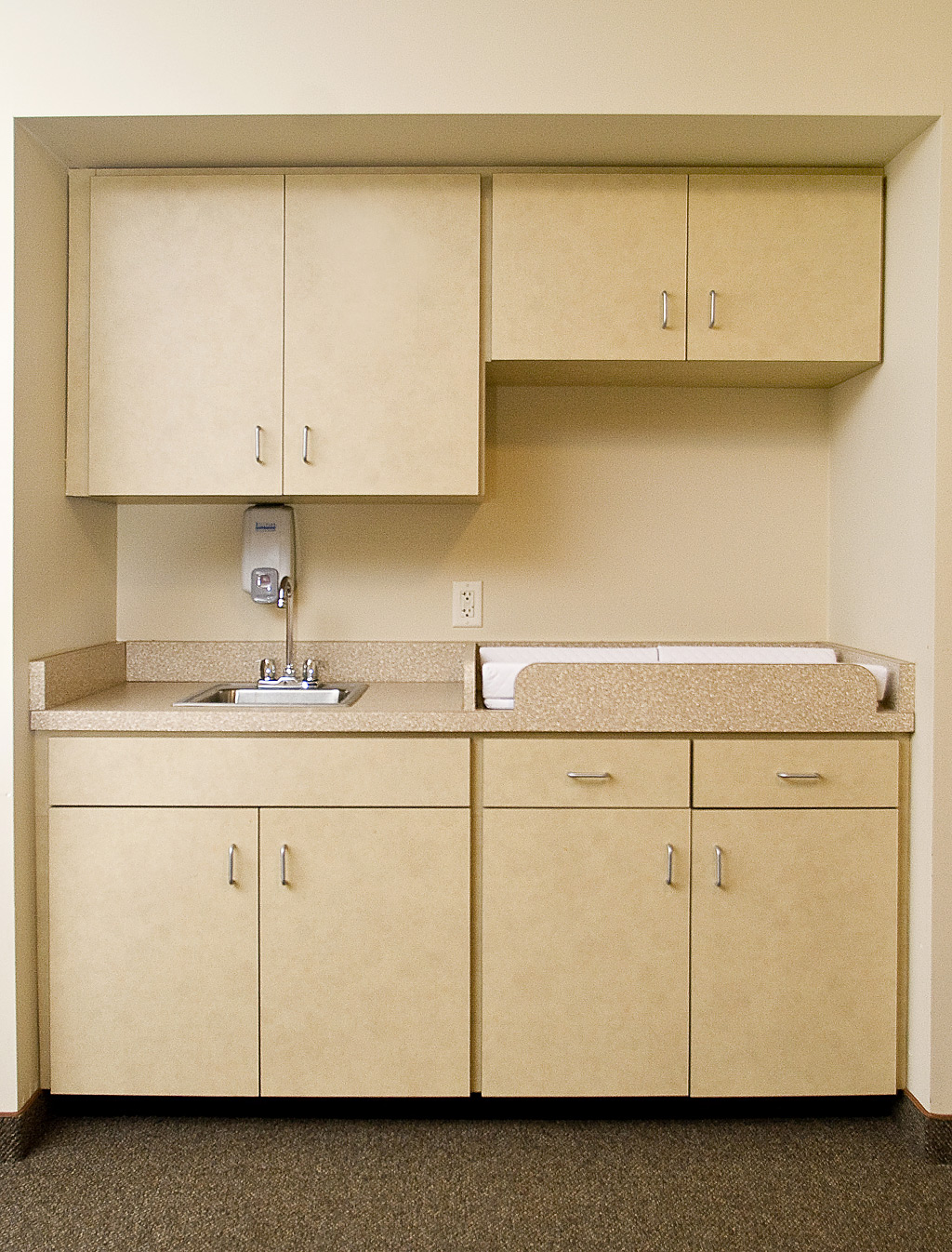 We also worked with the church to design cabinets for the sacristy, community kitchen and storage areas. The cabinets in the sacristy needed to store vestments and linens with large drawers, a fireproof metal lined storage cabinet for incense burners, and wardrobe storage for the priest and servers. The community kitchen has cabinets for dish storage, pantry storage, dish cart storage, an island work counter and a pass thru window for serving. In the child care area are storage cabinets with a sink area and infant changing station.