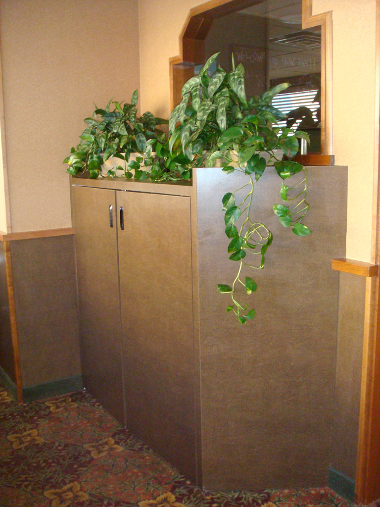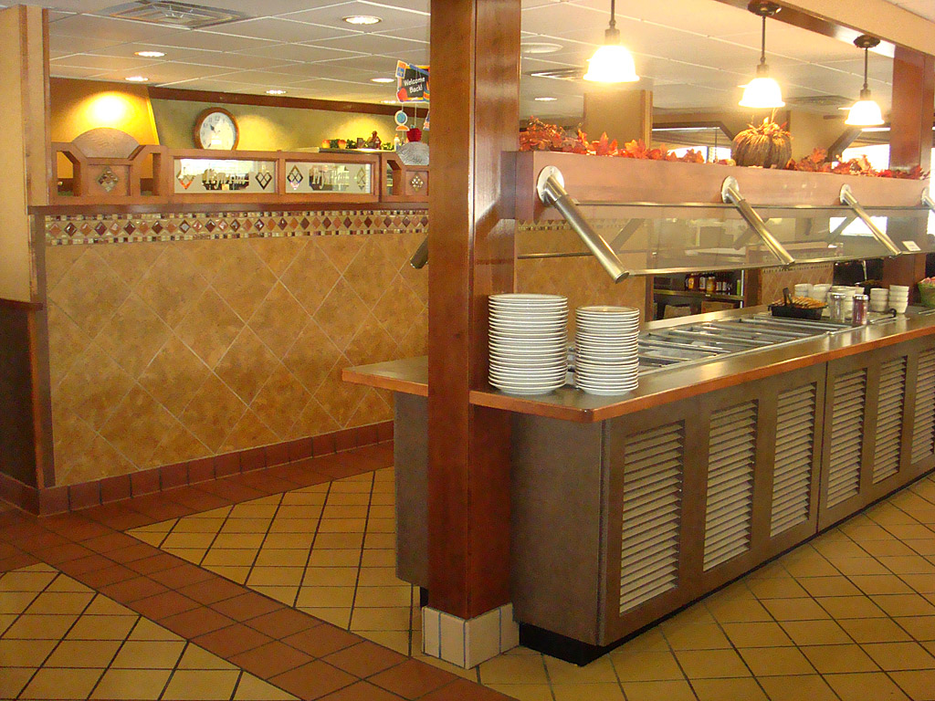 Felling Products worked with the Fry’n Pan Restaurants when they remodeled their restaurants in Sioux Falls, SD, Yankton, SD and Wahpeton, ND. The salad bars are built between columns. The cabinet has louvered doors for air movement. The sneezeguard has a wood shroud with brushed stainless steel support arms with glass panels. The wood divider that sets on the low wall has a maple wood frame and etched glass. The cashier counter has a raised purse shelf with a work area behind for an uncluttered presentation. There are storage cabinets for customer newspapers and enclosure for vacuum cleaner and supplies.