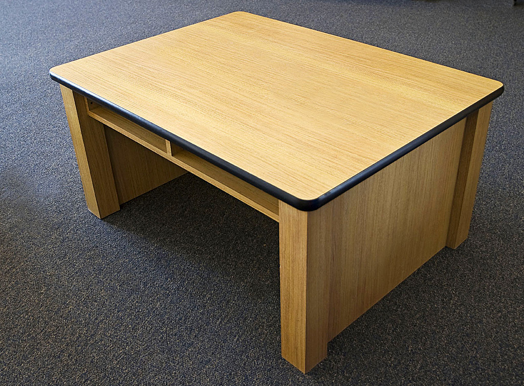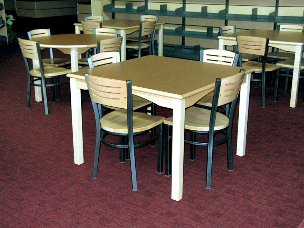 Felling Products offers a wide range of tables and bases for library and classrooms. Library tables can be designed for computer use with pull-out keyboards and wire chases. Classroom tables can include storage cubicle and special shapes like kidney or horseshoe. Tables are available in different sizes, shapes and finishes. Table tops are 1-1/4" thick, top surface can be covered with high pressured plastic laminate or wood veneer. A wide variety of edge styles are available — self-edged, vinyl T edges, PVC edges, and solid wood edges in a variety of sizes and profiles. Bases are made of metal, plastic laminate and solid wood, in a variety of styles.