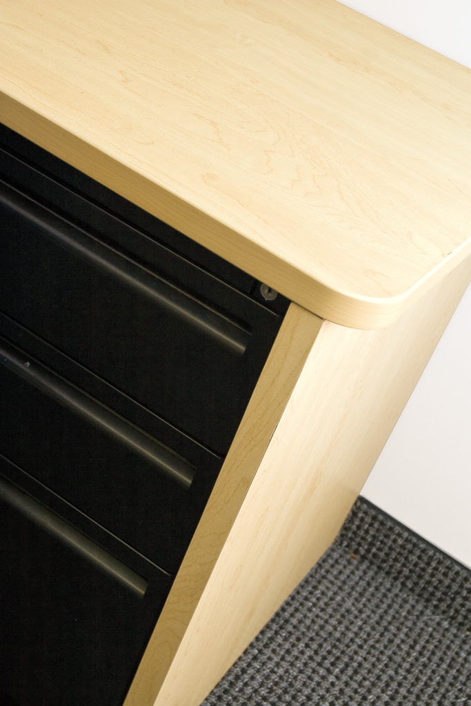 Work surfaces are available in 1-1/4” thickness and 1-3/4” thickness. Work surfaces have a 1-1/8” or 1-5/8” thick composite wood core, M2 industrial grade. The top surface is covered with a 1/16” thick high pressured plastic laminate in your choice of Wilsonart, Pionite, Nevamar, and Formica brand laminates, with styles including standard wood grains, solid colors and patterns. The bottom of the work surface is covered with a balancing backer sheet.
