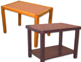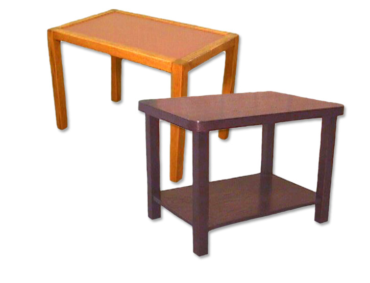 Reception tables range from end tables to sofa tables and are available in various sizes and heights. Table tops can be covered with plastic laminate or wood veneer. Tables are constructed with a wood frame and legs and an can be built with an optional bottom shelf.